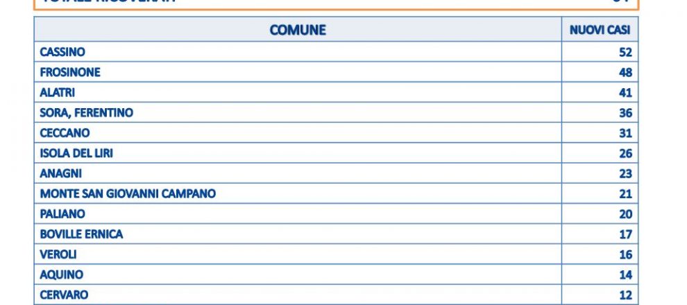 È Cassino la città con più contagi con 52, seguono Frosinone con 48, Alatri con 41. Poi 36 a Sora e Ferentino, 31 a Ceccano. 66 i comuni da 26 a 1 caso.