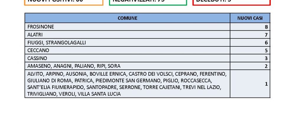 Il comune dove si registrano più casi è Frosinone con 8, seguono Alatri con 7, Fiuggi e Strangolagalli con 6 e Ceccano con 5.