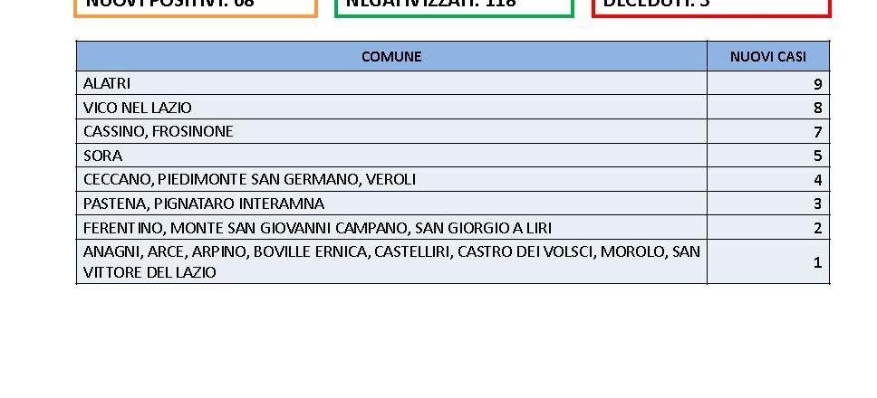 Tre i decessi nelle ultime 24 ore: un uomo di 79 anni di Ferentino, una donna di 75 di Cassino e un uomo di 72 anni di Cassino.