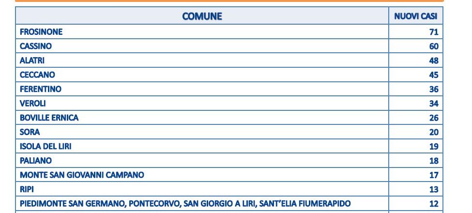 Frosinone conta 71 contagi, Cassino 60, Alatri 48, Ceccano 45, Ferentino 36, Veroli 34. Sono 68 i comuni da 26 a 1 contagio.