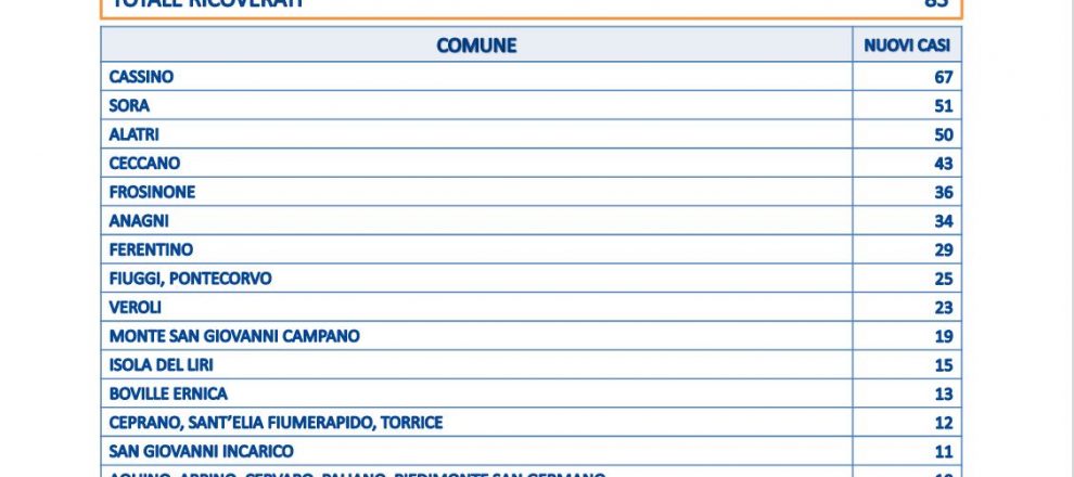Ancora 12 positivi a Ceprano, Sant’Elia Fiumerapido e Torrice; 11 a San Giovanni In-carico; 10 ad Aquino, Arpino, Cervaro, Paliano e Piedimonte San Germano; 9 a Ca-strocielo, Pescosolido, Pofi, Roccasecca e Supino; 8 ad Atina, Morolo e Patrica; 7 a Castro dei Volchi e Villa Santa Lucia; 6 ad Amaseno, Castelliri, Esperia, San Donato Val di Comino, 5 ad Acuto, Arce, Broccostella, Giuliano di Roma, Ripi, Strangolagalli e Vallemaio.