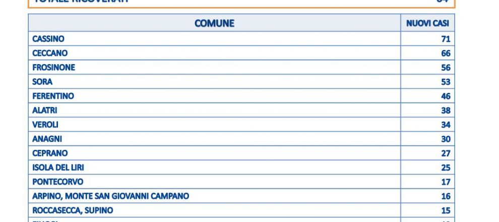 È Cassino che registra il numero più alto di positivi: 71. Poi Ceccano 66, Frosinone 56, Sora 53. Sono 46 a Ferentino, 38 ad Alatri, 34 a Veroli, 30 ad Anagni.
