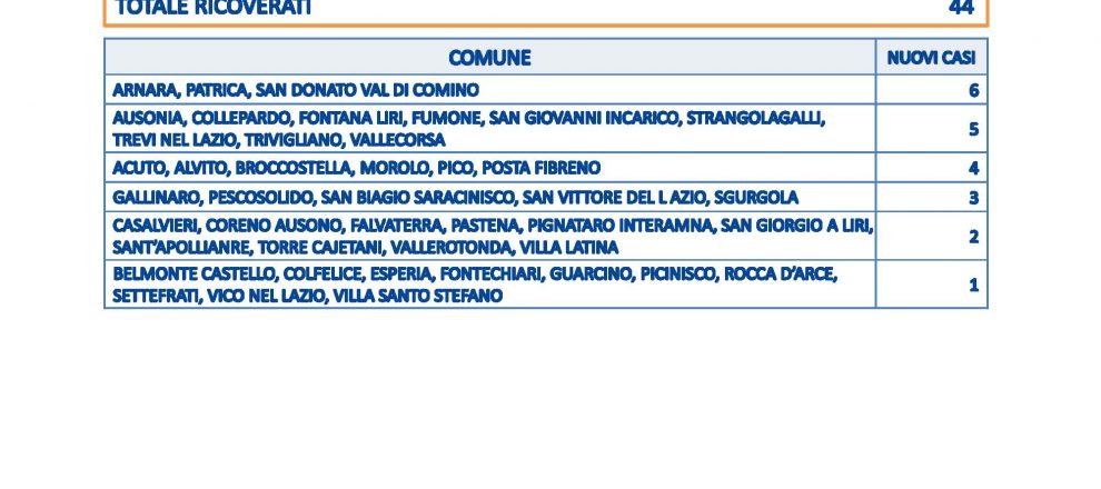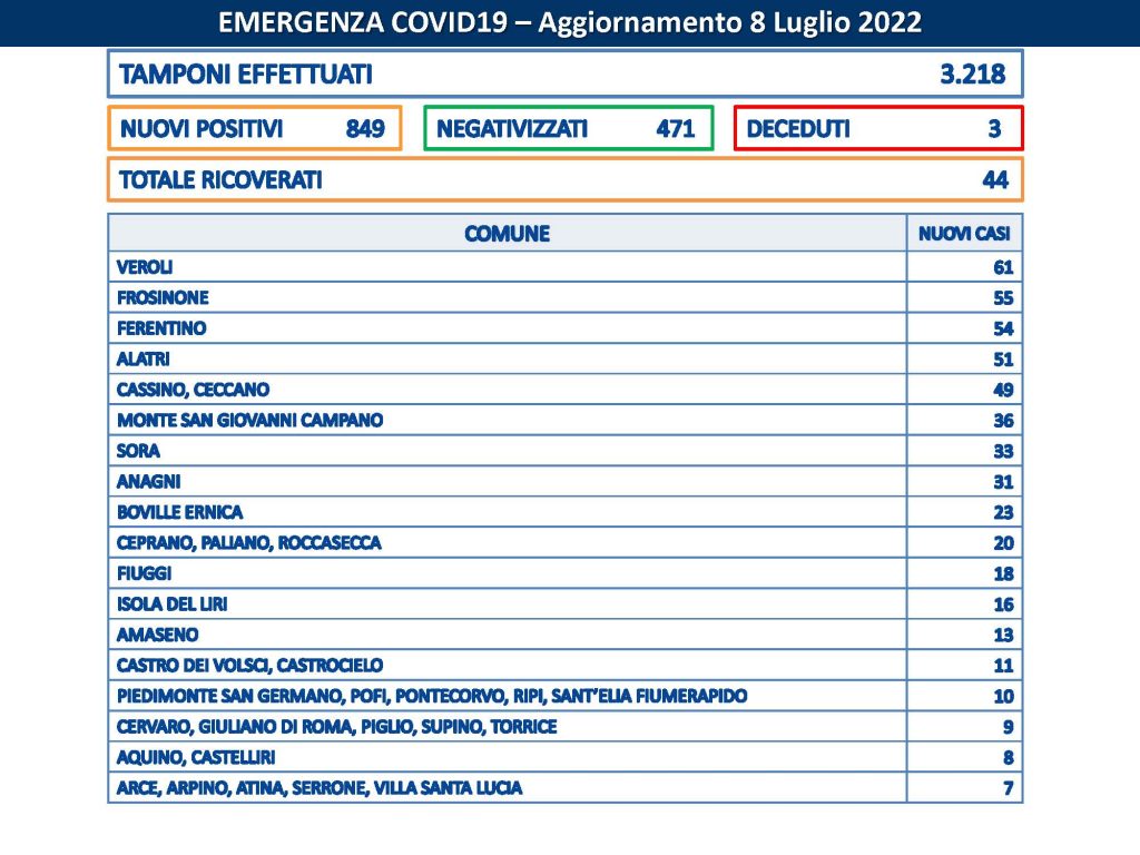 849 nuovi casi in provincia di Frosinone dove ci sono 3 decessi: tre donne, una 83enne di Sgurgola, una 85enne di Fiuggi e una 86enne di Cervaro. Il tasso di positività è al 26,3% a fronte dei 3.218 tamponi processati. 471 i guariti, mentre i ricoverati passano da 35 a 44 in 24 ore.