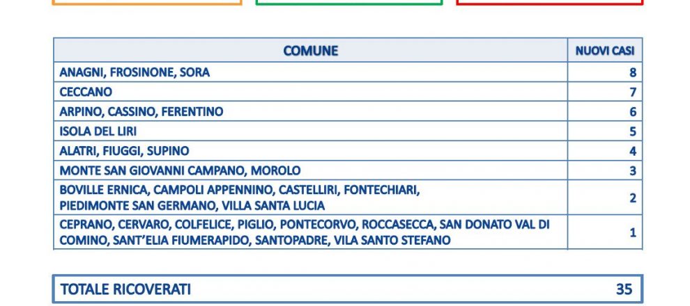 Le città che contano più contagi sono Anagni, Frosinone e Sora con 8. Seguono Ceccano con 7; Arpino, Cassino e Ferentino con 6, Isola del Liri con 5. Poi 4 positivi ad Alatri, Fiuggi e Supino; 3 a Monte San Giovanni Campano e Morolo.
