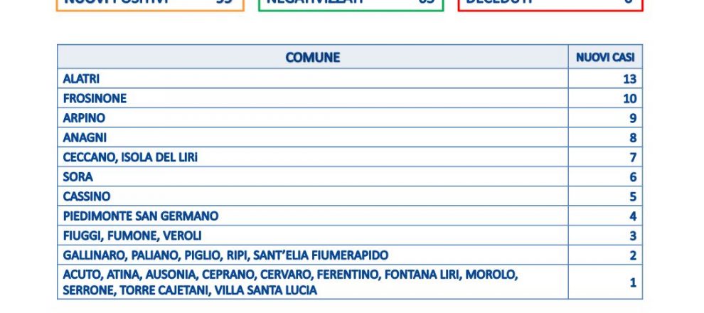 È Alatri il comune con più contagi: ne conta 13, segue Frosinone con 10, Arpino con 9, Anagni con 8. 7 casi a Ceccano, Isola del Liri, 6 a Sora e 5 a Cassino.