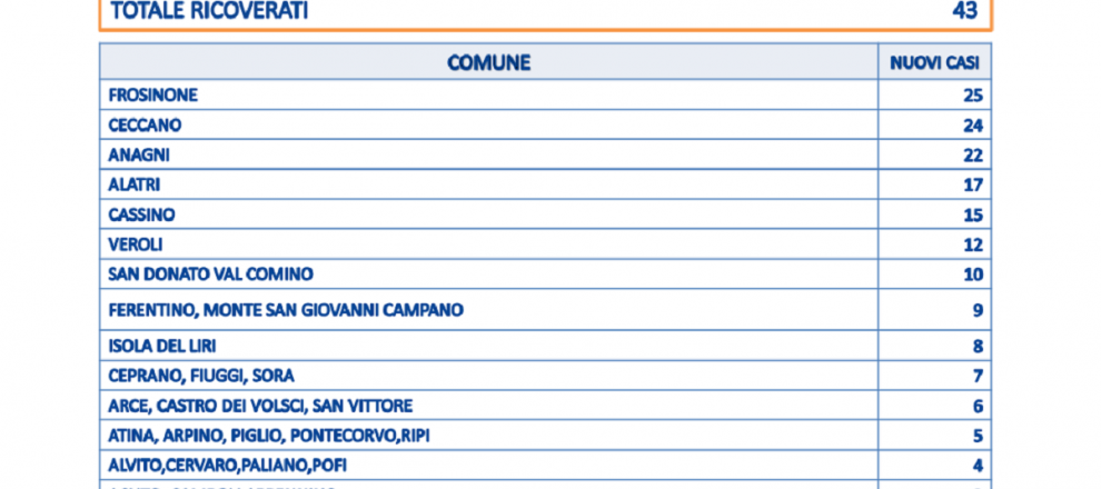 A Frosinone ci sono 25 contagi. A Ceccano 24. Ad Anagni sono 22. 17 i casi ad Alatri. 15 a Cassino. A Veroli ci sono 12 nuovi positivi mentre a san Donato Valcomino 10.