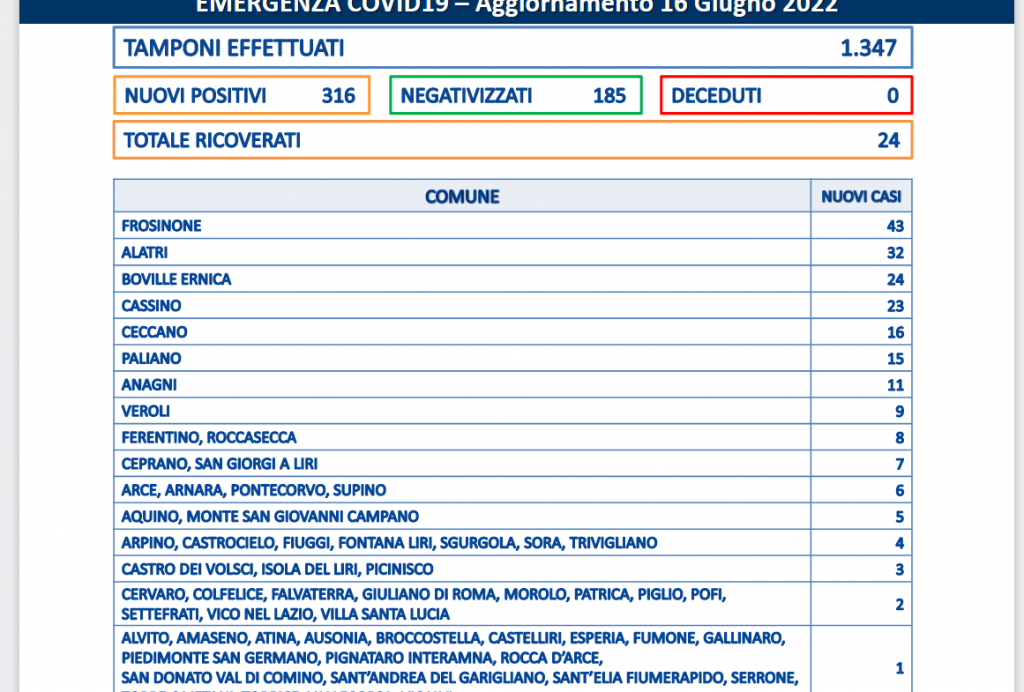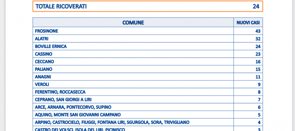 Frosinone conta 43 contagi, Alatri 32, Boville 24, cassino 23, Ceccano 16, Paliano 15, Anagni 11, Veroli 9.