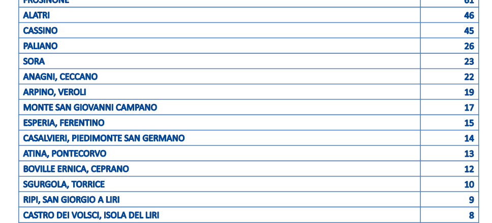FROSINONE – 12 GEN – Sono 850 i nuovi casi in provincia di Frosinone su 6.543 tamponi processati. Sono 828 i guariti, 85 i ricoveri totali e tra le buone notizie del giorno non risultano decessi. Il capoluogo ciociaro conta il maggior numero di casi a quota 61, seguono Alatri a 46, Cassino a 45, 26 per Paliano, 23 a Sora, 22 ad Aanagni e Ceccano. In doppia cifra altri 7 comuni.