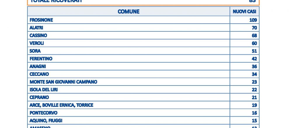 FROSINONE – 29 GEN – Sono 942 i nuovi casi in provincia di Frosinone su 6.275 tamponi processati. Ilo tasso di positività resta alto al 15%. Anche oggi i guariti superano i nuovi contagi a quota 1.117. Non ci sono decessi ed i ricoverati scendono ad 83. Il comune con il maggior numero di positività riscontrate è Frosinone con 109, seguono Alatri con 70, Cassino 68, Veroli 60, Sora 51, Ferentino 42, 36 ad Aanagni, Ceccano 34. da 23 contyagi a 7 sono coinvolti altri 23 comuni.