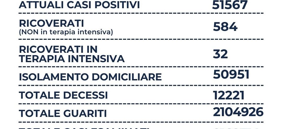 Nel Lazio su un totale di 9.923 tamponi si registrano 1.063 nuovi casi positivi (-1.088), sono 2 i decessi, 584 i ricoverati (-22), 32 le terapie intensive ( = ) e +2.054 i guariti. Il rapporto tra positivi e tamponi è al 10,7%.