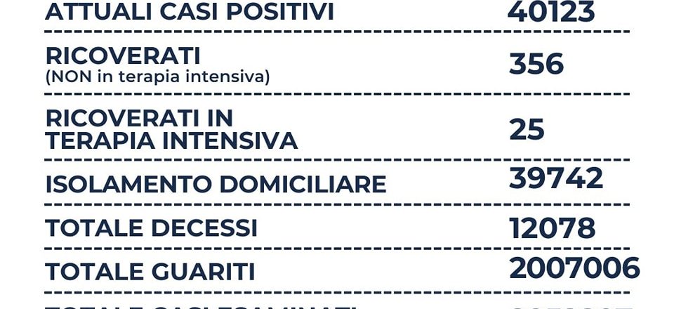Asl Roma 1: 259 nuovi casi e 1 decesso. Asl Roma 2: 238 nuovi casi e 1 decesso. Asl Roma 3: 190 nuovi casi e 1 decesso. Asl Roma 4: 62 nuovi casi e 0 i decessi. Asl Roma 5: 101 nuovi casi e 0 i decessi. Asl Roma 6: 99 nuovi casi e 0 i decessi.
