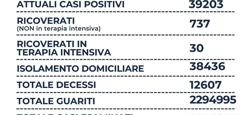 Nel Lazio su un totale di 11.800 tamponi, si registrano 1.323 nuovi casi positivi (-922), sono 3 i decessi (-5), sono 737 i ricoverati (+5), 30 le terapie intensive ( = ) e +2.953 i guariti. Il rapporto tra positivi e tamponi è al 11,2%.