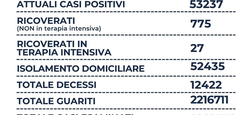 Nel Lazio su un totale di 6.840 tamponi, si registrano 1.366 nuovi casi positivi (-1.787), sono 6 i decessi (+3), sono 775 i ricoverati (-18), 27 le terapie intensive (-2) e +2.291 i guariti. Il rapporto tra positivi e tamponi è al 19,9%.
