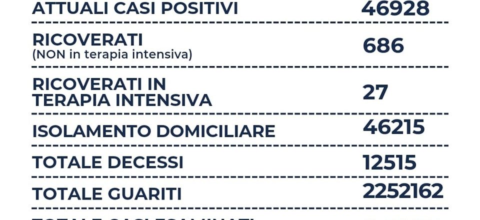 Nel Lazio, su 1.654 tamponi molecolari e 11.246 tamponi antigenici per un totale di 12.900 tamponi, si registrano 1.700 nuovi casi positivi (-35), sono 11 i decessi (-1), 686 i ricoverati (-25), 27 le terapie intensive (-4) e +2.355 i guariti. Il rapporto tra positivi e tamponi è al 13,1%.