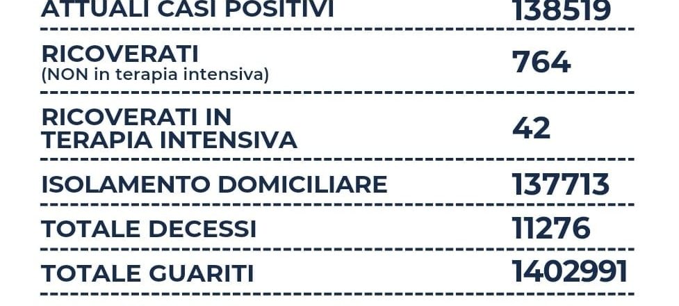 Nel Lazio su un totale di 25.477 tamponi si registrano 2.740 nuovi casi positivi (-298), sono 4 i decessi (=), 764 i ricoverati (-20), 42 le terapie intensive (-4) e +4.059 i guariti. Il rapporto tra positivi e tamponi è al 10,7%.