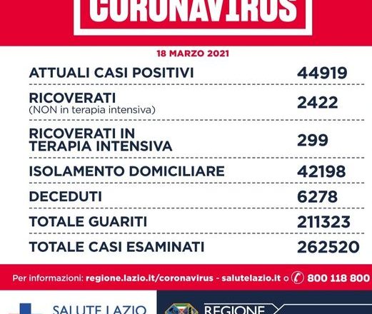 Nelle province si registrano 579 casi e sono otto i decessi nelle ultime 24h. Nella Asl di Latina sono 225 i nuovi casi e nessun decesso. Nella Asl di Frosinone si registrano 234 nuovi casi e sei decessi di 77, 80, 81, 87, 92 e 93 anni con patologie.