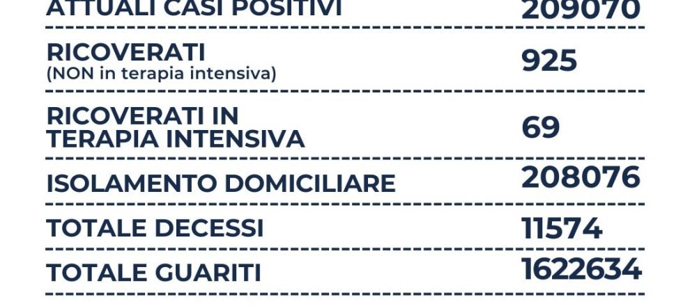 Nel Lazio su 42.855 tamponi si registrano 10.062 nuovi casi positivi (-3.324). Il rapporto è al 23,4%. sono 15 i decessi (+4), 925 i ricoverati (+41), 69 le terapie intensive (+6) e +7.029 i guariti.