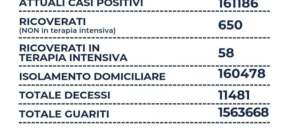 Nel Lazio su 4.775 tamponi molecolari e 33.425 tamponi antigenici per un totale di 38.200 tamponi, si registrano 10.367 nuovi casi positivi (-1.162), sono 6 i decessi (-3), 650 i ricoverati (+36), 58 le terapie intensive (+3) e +6.156 i guariti. Il rapporto tra positi-vi e tamponi è al 27,1%.
