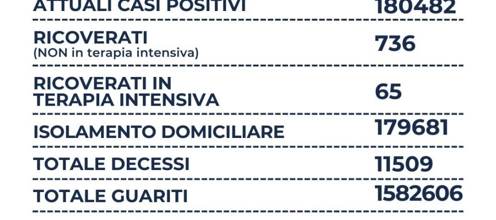 Nel Lazio su 6.526 tamponi molecolari e 35.321 tamponi antigenici per un totale di 41.847 tamponi, si registrano 11.257 nuovi casi positivi (-2.298 in meno in 24 ore), sono 7 i decessi (-5), 736 i ricoverati (+15), 65 le terapie intensive (+3) e +6.925 i guariti. Il rapporto tra positivi e tamponi è al 26,9%.