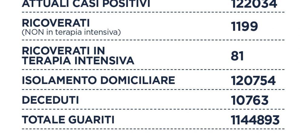Nel Lazio su 11.716 tamponi molecolari e 45.746 tamponi antigenici per un totale di 57.462 tamponi, si registrano 8.957 nuovi casi positivi (-2.473), sono 10 i decessi ( = ), 1.199 i ricoverati (-1), 81 le terapie intensive (+2) e +5.912 i guariti. Il rapporto tra positivi e tamponi è al 15,5%.