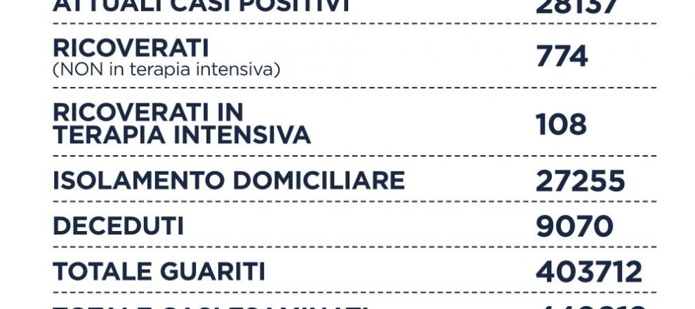774 i ricoverati (-12), 108 le terapie intensive (-2) e +660 i guariti. «Dopo diversi giorni registriamo un calo di occupazione in area medica e nelle terapie intensive un timido segnale che dovra’ essere consolidato», afferma l’assessore regionale alla Sanità, A-lessio D’Amato.