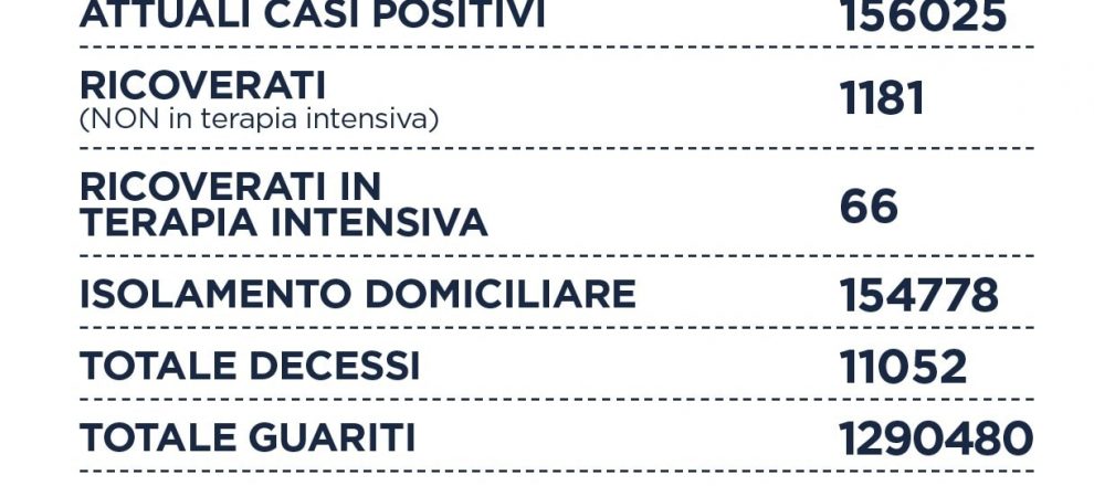 Nel Lazio su 5.151 tamponi molecolari e 14.516 tamponi antigenici per un totale di 19.667 tamponi, si registrano 3.396 nuovi casi positivi (+624), sono 16 i decessi (+5), 1.181 i ricoverati (+42), 66 le terapie intensive (-4) e +5.689 i guariti. Il rapporto tra po-sitivi e tamponi è al 17,3%. I casi a Roma città sono a quota 1.928.