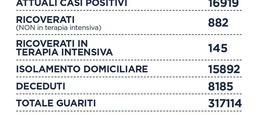 Oggi nel Lazio su oltre 11mila tamponi nel Lazio (+4.225) si registrano 195 nuovi casi positivi (-56), Il rapporto tra positivi e tamponi è al 1,7%. I decessi sono 10 (+6), mentre i guariti sono 2.036. I ricoverati sono 882 (-47), le terapie intensive sono 145 (-1).
