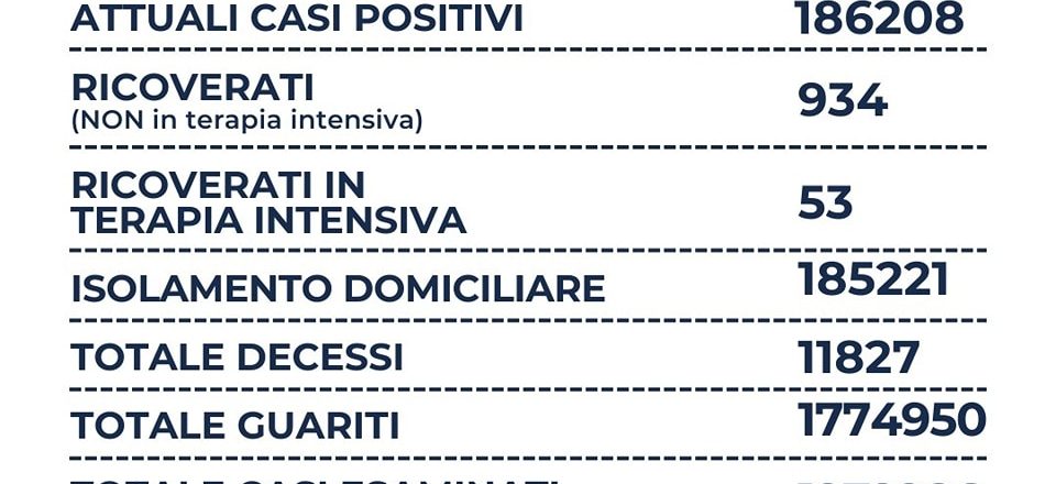 Nel Lazio su 2.655 tamponi molecolari e 16.730 tamponi antigenici per un totale di 19.385 tamponi, si registrano 2.799 nuovi casi positivi (-422), sono 7 i decessi ( = ), 934 i ricoverati (-41), 53 le terapie intensive (-2) e +9.923 i guariti. Il rapporto tra positivi e tamponi è al 14,4%. I casi a Roma città sono a quota 1.343.