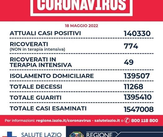 Nel Lazio su un totale di 25.344 tamponi si registrano 2.883 nuovi casi positivi (-1.228), sono 16 i decessi (+8) il dato comprende alcuni recuperi di notifiche, 774 i ricoverati (-26), 49 le terapie intensive (-4) e +5.053 i guariti. Il rapporto tra positivi e tamponi è al 11,3%.