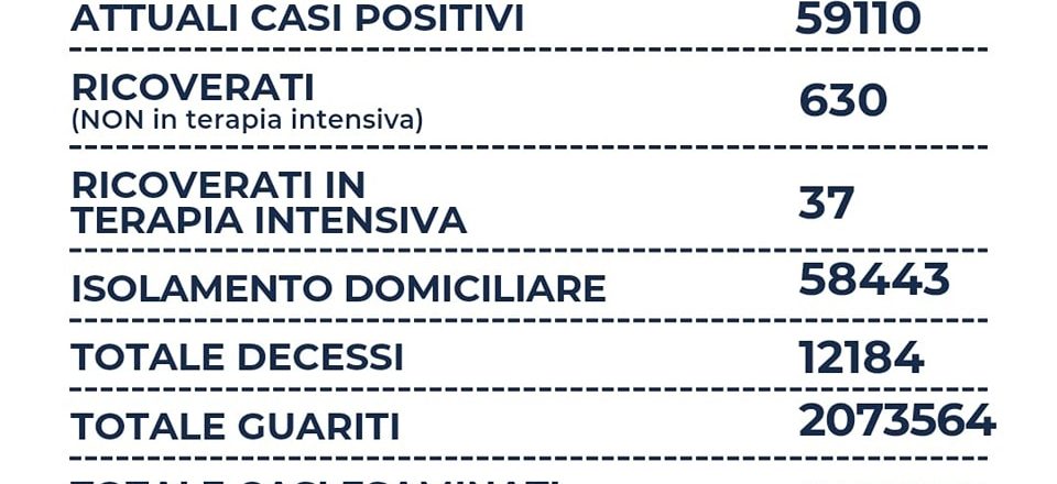 Nel Lazio su 3.523 tamponi molecolari e 16.465 tamponi antigenici per un totale di 19.988 tamponi, si registrano 2.903 nuovi casi positivi (-413), sono 3 i decessi (-4), 630 i ricoverati (+10), 37 le terapie intensive (+1) e +2.045 i guariti. Il rapporto tra positivi e tamponi è al 14,5%.