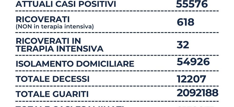 Nel Lazio su un totale di 20.336 tamponi, si registrano 2.981 nuovi casi positivi (-298), sono 3 i decessi (-2), 618 i ricoverati (-11), 32 le terapie intensive (+1) e +5.341 i guariti. Il rapporto tra positivi e tamponi è al 14,6%. I casi a Roma città sono a quota 1.533.