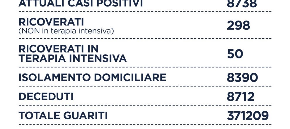 Nel Lazio su 15.816 tamponi molecolari e 22.659 tamponi antigenici per un totale di 38.475 tamponi, si registrano 222 nuovi casi positivi (-126), e in calo rispetto a sabato scorso 9 ottobre (-8), 5 i decessi (-2), 298 i ricoverati (+4), 50 le terapie intensive ( = ) e 249 i guariti. Il rapporto tra positivi e tamponi è al 0,5%.