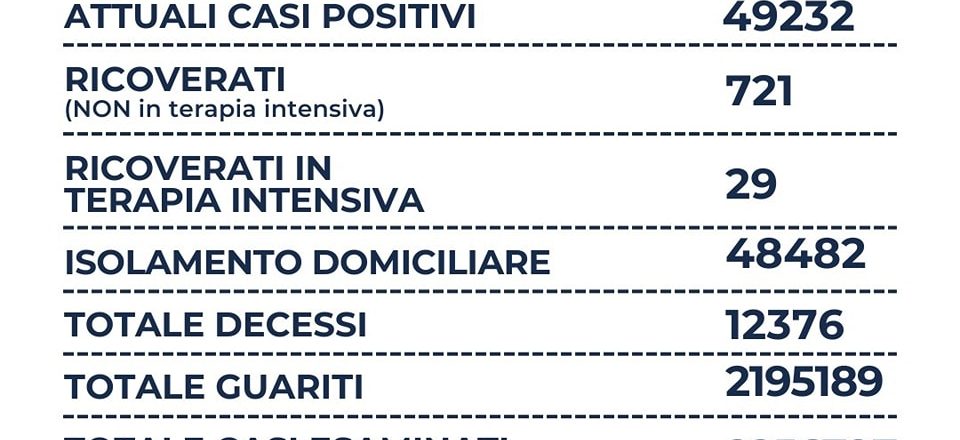 Nel Lazio su un totale di 18.987 tamponi, si registrano 3.086 nuovi casi positivi (-1.258), sono 6 i decessi (-2), sono 721 i ricoverati (-16), 29 le terapie intensive (-3) e +2.579 i guariti. Il rapporto tra positivi e tamponi è al 16,2%.