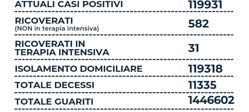 Nel Lazio su 5.972 tamponi molecolari e 20.185 tamponi antigenici per un totale di 26.157 tamponi, si registrano 3.218 nuovi casi positivi (+1.985), sono 2 i decessi (-3), 582 i ricoverati (-15), 31 le terapie intensive (-2) e +4.404 i guariti. Il rapporto tra positivi e tamponi è al 12,3%. I casi a Roma città sono a quota 1.942.”