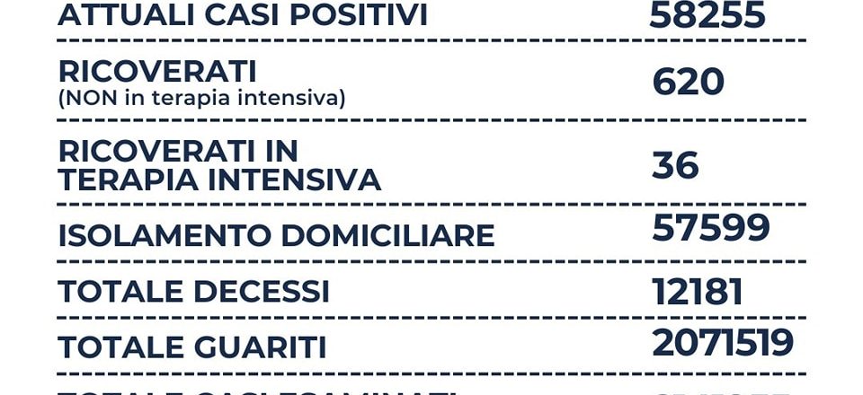 Nel Lazio su un totale di 17.727 tamponi, si registrano 3.316 nuovi casi positivi (-341), sono 7 i decessi (+1), 620 i ricoverati (+6), 36 le terapie intensive (+2) e +2.970 i guariti. Il rapporto tra positivi e tamponi è al 18,7%.