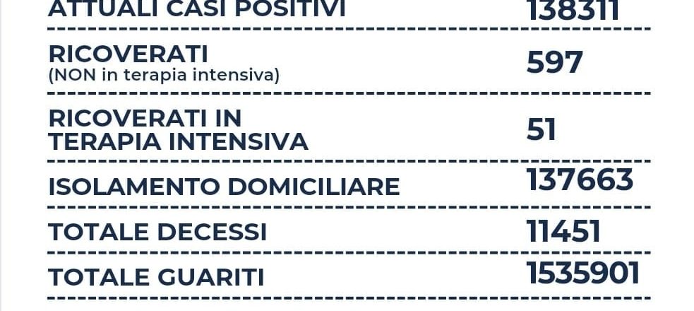 Nel Lazio su 2.620 tamponi molecolari e 13.744 tamponi antigenici per un totale di 16.364 tamponi, si registrano 3.623 nuovi casi positivi (-3.070), sono 5 i decessi (+3), 597 i ricoverati (+45), 51 le terapie intensive (-1) e +4.557 i guariti. Il rapporto tra positivi e tamponi è al 22,1%.