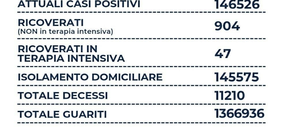 Nel Lazio su 7.223 tamponi molecolari e 20.268 tamponi antigenici per un totale di 27.491 tamponi, si registrano 3.859 nuovi casi positivi (-1.005), sono 9 i decessi (-6), 904 i ricoverati (-20), 47 le terapie intensive (-3) e +4.257 i guariti. Il rapporto tra positivi e tamponi è al 14,0%. I casi a Roma città sono a quota 1.931.