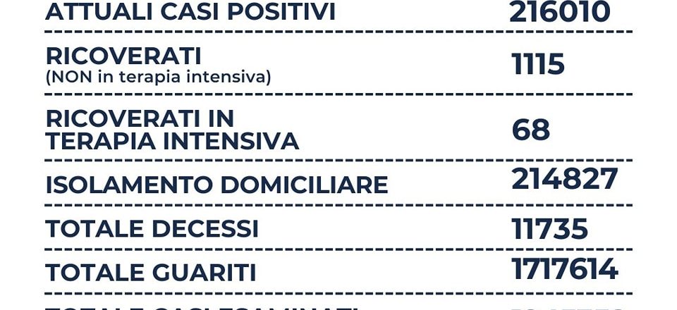 Nel Lazio su 4.259 tamponi molecolari e 20.822 tamponi antigenici per un totale di 25.081 tamponi, si registrano 3.958 nuovi casi positivi (-651), sono 16 i decessi ( = ), 1.115 i ricoverati (-12), 68 le terapie intensive (-7) e +6.469 i guariti. Il rapporto tra posi-tivi e tamponi è al 15,7%. I casi a Roma città sono a quota 1.670.
