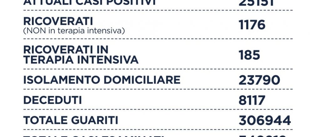 Oggi nel Lazio su 10771 tamponi molecolari (+1027) si registrano 308 nuovi casi positivi (+16), i decessi sono 16 (+5), i ricoverati sono 1176 (-43). I guariti 1788, le terapie intensive sono 185 (-9). Il rapporto tra positivi e tamponi è al 2,8%. Diminuiscono ricoveri e terapie intensive.