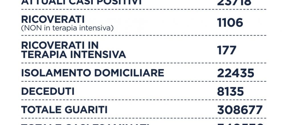 Oggi nel Lazio su 12.645 tamponi molecolari (+1.874) si registrano 318 nuovi casi positivi (+10), i decessi sono 18 (+2), i ricoverati sono 1.106 (-70). I guariti 1.733, le terapie intensive sono 177 (-8). Il rapporto tra positivi e tamponi è al 2,5%. Diminuiscono ricoveri e terapie intensive.