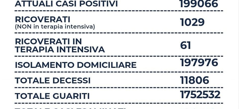 Su oltre 20 mila tamponi si registrano 4.047 nuovi casi positivi. Il tasso di positività passa dal 14,7 al 19,6%. Scendono di 47 unità i ricoveri che sono 1.029, stabili a 61 le terapie intensive. Quasi 11 mila le persone guarite.