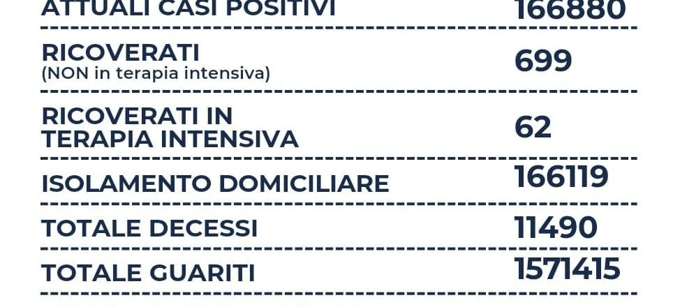 Nel Lazio su un totale di 19.421 tamponi, si registrano 4.777 nuovi casi positivi (-3.896), sono 7 i decessi (+5), 699 i ricoverati (+27), 62 le terapie intensive (+4) e +4.514 i guariti. Il rapporto tra positivi e tamponi è al 24,5%. I casi a Roma città sono a quota 2.954.