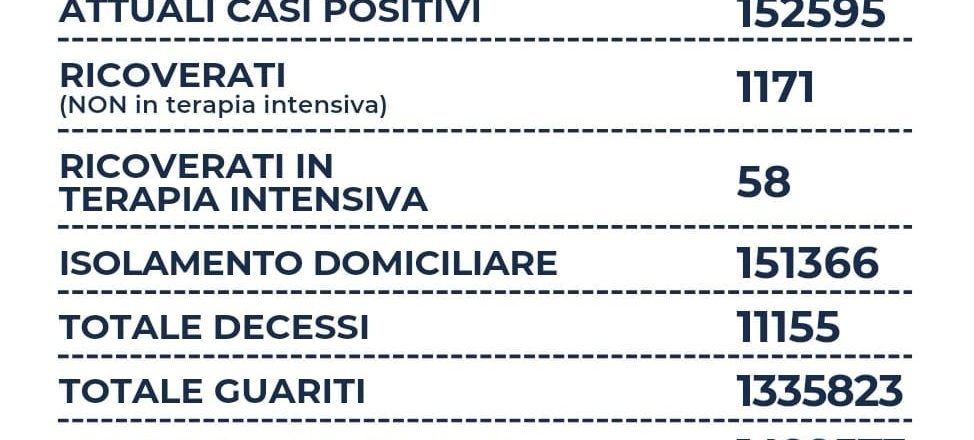 Nel Lazio su un totale di 39.390 tamponi, si registrano 4.759 nuovi casi positivi (-294), sono 15 i decessi (+4), 1.171 i ricoverati (+26), 58 le terapie intensive ( = ) e +5.450 i guariti. Il rapporto tra positivi e tamponi è al 12,0%.