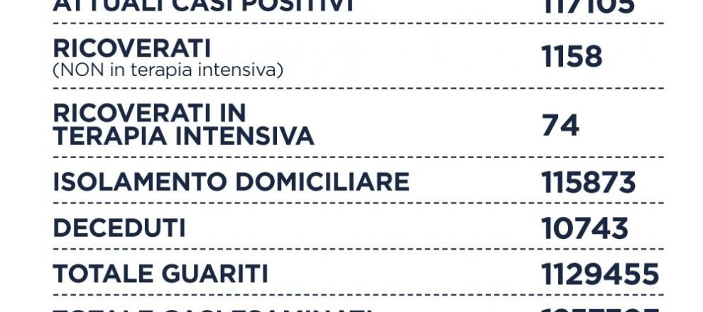 Nel Lazio su 30.398 tamponi si registrano 4.418 nuovi casi positivi (-2.991), sono 9 i decessi (+4), 1.158 i ricoverati (+21), 74 le terapie intensive ( = ) e +6.601 i guariti. Il rapporto tra positivi e tamponi è al 14,5%.