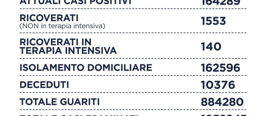 In calo l’incidenza e valore RT, la prima arriva a 676 per 100 mila abitanti (870 scorsa settimana), il valore RT a 0.74, rispetto a 0.94 della scorsa settimana. Cala la pressione sulla rete ospedaliera e sulle terapie intensive. È in corso la predisposizione del piano straordinario di recupero di 19 mila interventi chirurgici.