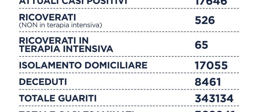 Oggi nel Lazio si registrano 548 nuovi casi positivi, i nuovi casi positivi sono 19 in meno rispetto a giovedì 12 agosto. Sono 6 i decessi. I ricoverati sono 526 (+2), le terapie intensive sono 65 (+1), i guariti sono 613.