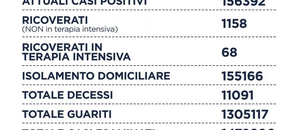 Nel Lazio su un totale di 44.907 tamponi si registrano 6.351 nuovi casi positivi (-2.341), sono 16 i decessi (-7), 1.158 i ricoverati (-19), 68 le terapie intensive (+2) e +6.416 i guariti. Il rapporto tra positivi e tamponi è al 14,1%.