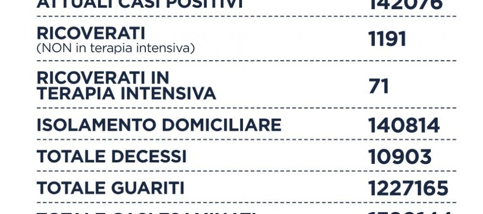 Nel Lazio su 43.905 tamponi si registrano 6.625 nuovi casi positivi. Sono 16 i decessi, 1.191 i ricoverati (+7), 71 le terapie intensive ( = ) e +5.865 i guariti.