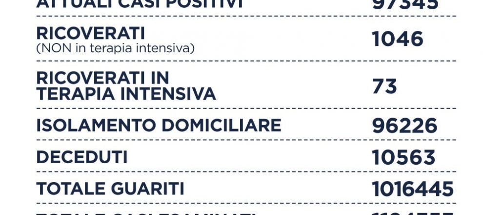Oggi nel Lazio su 52 mila tamponi si registrano 6.052 nuovi casi positivi (-84), sono 17 i decessi ( = ), 1.046 i ricoverati (+9), 73 le terapie intensive (-6) e +8.199 i guariti. Il rap-porto tra positivi e tamponi è al 11,4%.