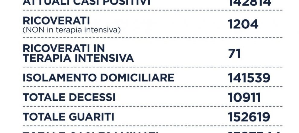 Nel Lazio su un totale di 44.126 tamponi si registrano 7.200 nuovi casi positivi. Sono 8 i decessi, 1.204 i ricoverati (+13), 71 le terapie intensive (=) e +6.454 i guariti. Il rapporto tra positivi e tamponi è al 16,3%.